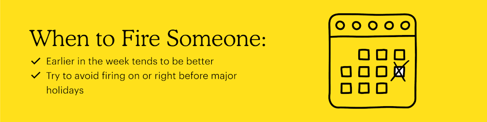 The timing of when you fire someone is important as well. As a general rule, firing someone earlier in the week tends to be better, as this gives them more weekdays where they can visit the unemployment office and search for new opportunities. Also, try to avoid firing employees right before any major holidays.