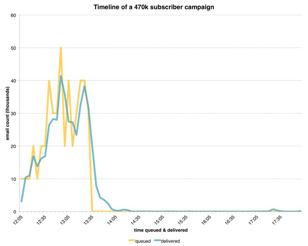 For larger campaigns, like the one in the following graph, payloads usually only include about 10,000 recipients each. Here, since the MTA isn’t waiting around for one giant payload of 470,000 to be built and queued at once, deliveries can start immediately.