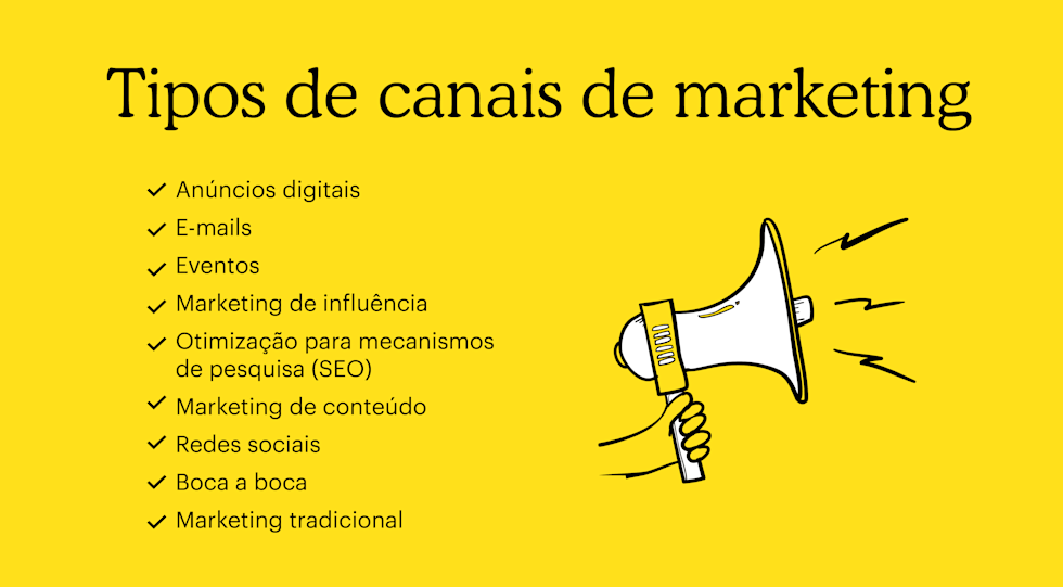 O canais de marketing são o meio usado para divulgar sua empresa. Os canais de marketing digital englobam métodos como publicidade digital, SEO, marketing de influenciadores, e-mail e mais. Cada um deles tem seus vantagens e propósitos únicos.
