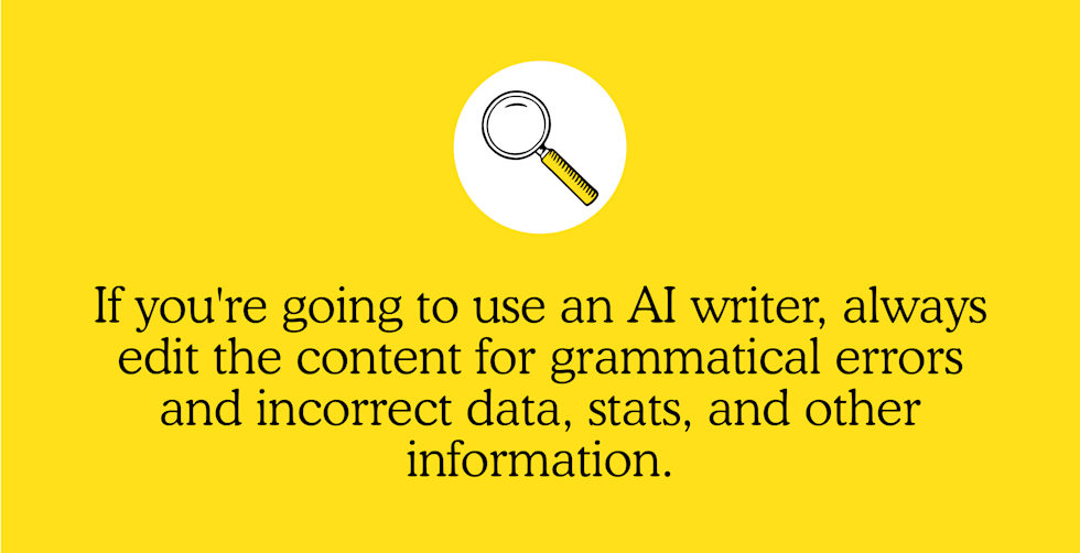 - Still require human intervention: Because AI writers take information that already exists on the web and stitches it together, all content still requires editing by a human. You should always fact-check any data or statistics mentioned in an article and ensure that it sounds like it's written by a human instead of a robot.