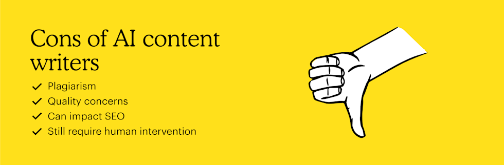 - Plagiarism: AI-generated content may be plagiarized. Because of how AI content generator tools work, there are plagiarism concerns. Remember, they rewrite existing content on the web to create a brand-new article. In addition, AI content might be too similar to another blog, so it's more likely to get flagged by search engines.