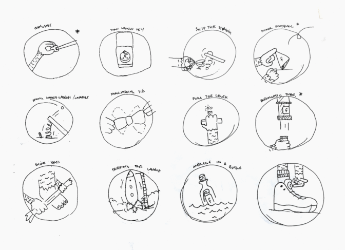 The computer is a pretty lousy brainstorming tool. If you start a project pushing pixels, you’ll likely find yourself in an inescapable loop constrained by your knowledge of software. Instead, we grab pens and big sheets of paper and start writing words down. For this project, words like “mouse trap,” “Rube Goldberg machine,” “pneumatic mail tube” and “slingshot” appeared. After the word vomit phase, we chose 5 or 10 words we felt good about. Then began the ugly sketching.