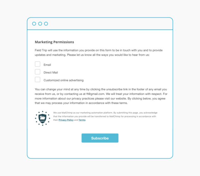 • Mailchimp’s permission terms: This section lets your contacts know that you’ll be storing their information in your Mailchimp account and provides links to our Privacy Policy and Terms of Use. It’s designed to help you (and Mailchimp) remain compliant with the GDPR, so it can’t be edited. If you collect contact information through other means (outside of these GDPR-friendly forms) and plan to keep that information in Mailchimp, please be sure to copy and paste our permission terms there, too.