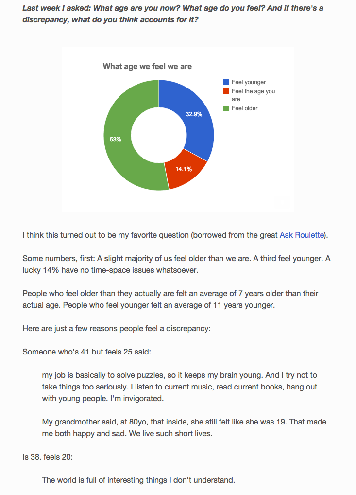 The time I spend on it also varies. The week I made a Thought Clock, it was several hours of putting all the replies in a spreadsheet and sorting everything properly. Other weeks, it can be just an hour. I try to spend more time on the newsletter during weeks when I have less going on in my day job and my life, and only spend less time on it when I really can’t afford to do more. I want to make sure it’s consistently good and also, I hope, raise the bar over time.