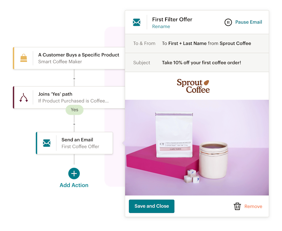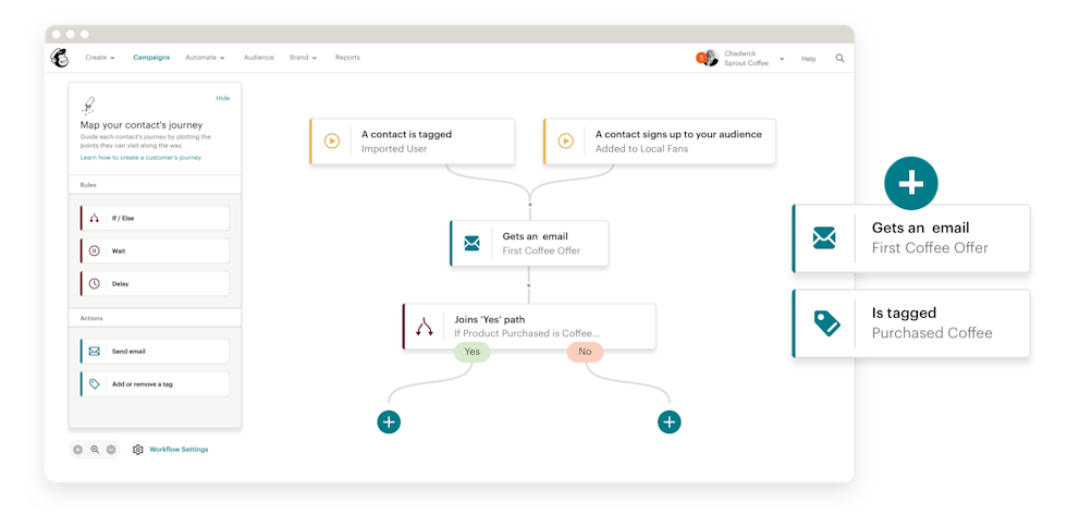 “Our Customer Journey Builder gives small businesses a way to design adaptable paths and messaging that guide customers where you want them to go,” says Sean Fletcher, Senior Product Marketing Manager at Mailchimp. “And then, automations execute relevant messages that increase your company’s marketing capacity.”