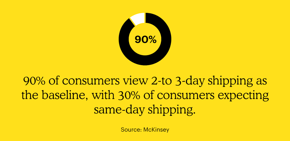 - Delivery speed: Delivery speed is crucial because your customers don’t want to wait to get their packages. You can also offer expedited options to customers to help you save on shipping costs. When it comes to shipping times, 90% of consumers view 2- to 3-day shipping as the baseline, with 30% of consumers expecting same-day shipping.