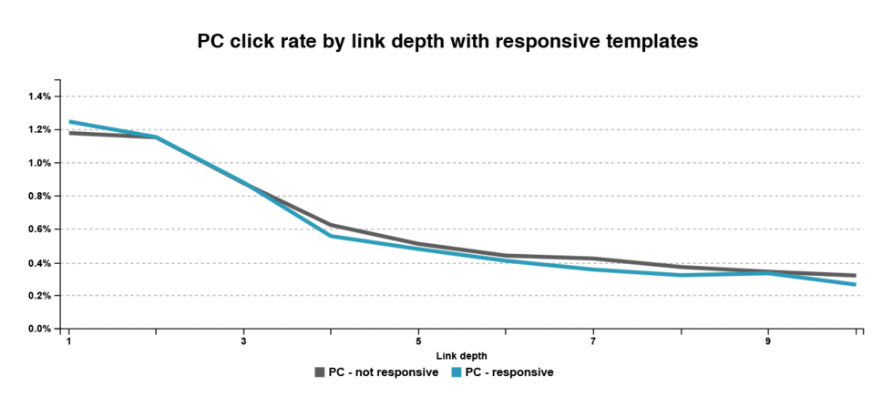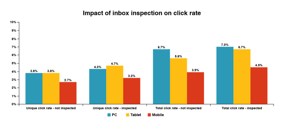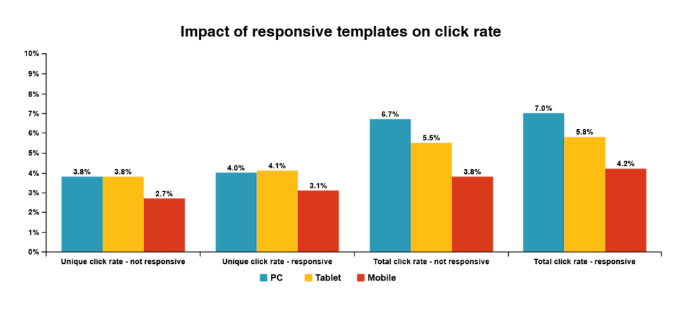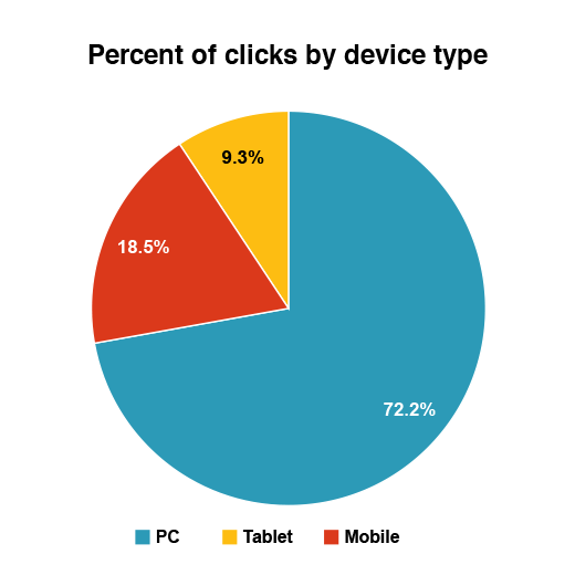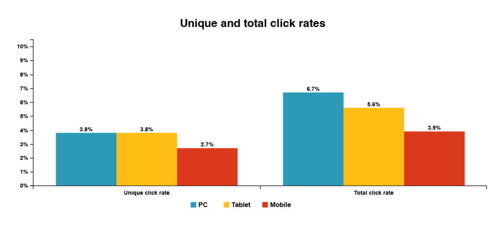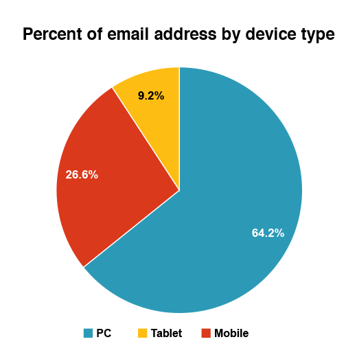 What did we find out? For starters, PCs, tablets, and mobile devices accounted for 64%, 9%, and 27% of email addresses, and 72%, 9%, and 18% of clicks, respectively. Right off the bat, we could tell that PC users click more.