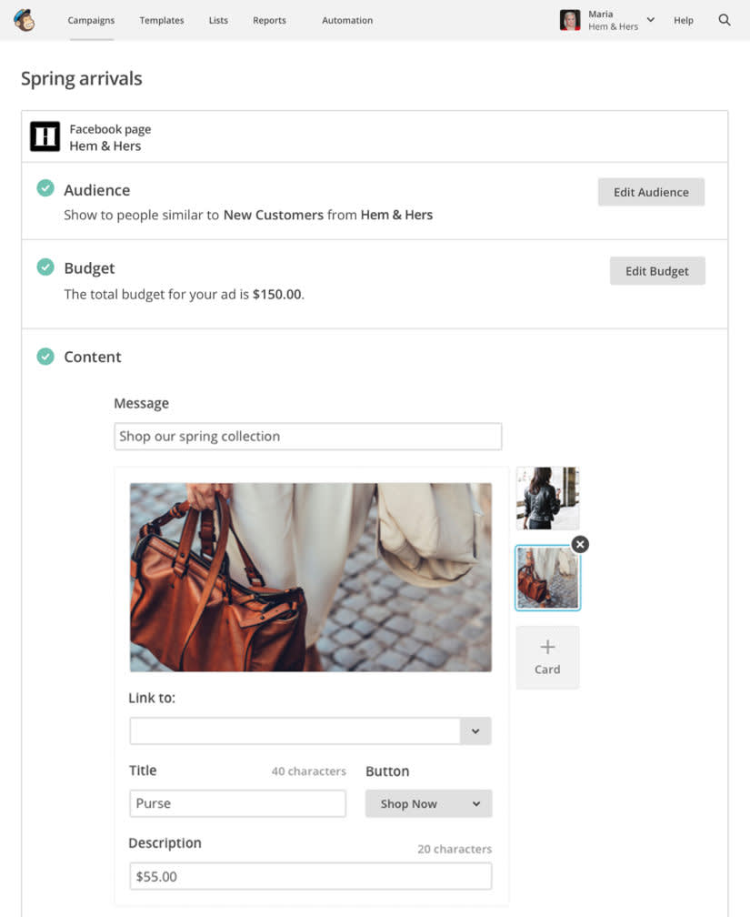 When we interviewed customers about what they wanted, they were clear: take the Mailchimp magic to other marketing channels. “We listened, and that’s why we chose Facebook as our next marketing channel. After email, Facebook ads are the next most popular choice with our customers for acquiring customers and generating revenue,” says Tom Klein, CMO. “We created an ad buying experience that feels like Mailchimp, so customers can create beautiful ads quickly and get back to building their business.” In just a few steps, you can create ads, set your targeting, and decide your budget. And if you’re already comfortable with Mailchimp’s interface, you’ll feel right at home.
