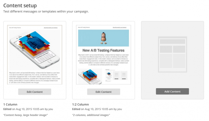 Here, you’ll decide which variable you’d like to test and how many different combinations of that particular variable to compare. The familiar A/B testing variables—Subject line, From name, and Send time—have now been joined by Content (more on that in a moment), and up to 3 combinations of a single variable can now be tested at once.