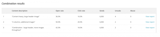 Speaking of A/B reports, they’ve also been redesigned to be more comprehensive and easier to understand. On the Test Results page, you’ll find the aggregate results for your entire test, along with a breakdown of results for each combination, so you can easily review the performance of each variable. And, if you’d like an even more detailed look at your data, the full campaign report for each combination is just a click away.