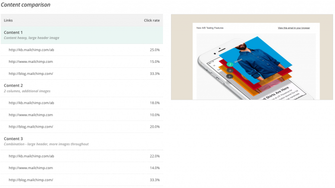 A/B reports also feature a brand new Links tab, with a Content Comparison tool that will provide more insight into the behavior of the links within your campaign. When testing content, this tool will help you quickly review the location and performance of links used within each combination. If your testing combinations have the same links throughout, this section of the report will allow you to identify which link drove the most clicks.
