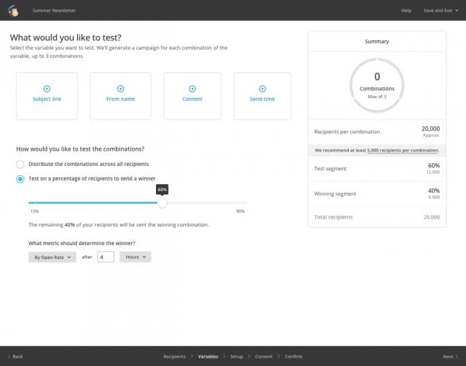 The Variables step is also where you’ll determine how you’d like to test the combinations, what percentage of your list you’d like to test, and which metric (open rate, click rate, or manual selection) will be used to determine the winner. The Summary table on the right side of the page will update as you make changes, displaying the number of combinations you’ve chosen to test, along with how many subscribers are in each of the testing and winning segments, when applicable.