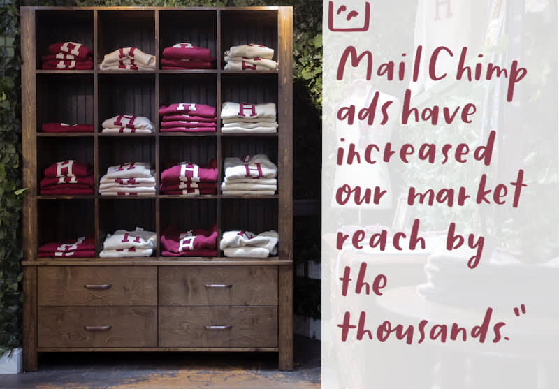 “Mailchimp ads have increased our market reach by the thousands—because our market is somewhat specific,” she says. “The features that allow us to narrow down our audience and target certain people are really helpful in making our ad campaigns as effective and efficient as possible. We look at the target audience and the impact that all of those ads are having, whether it’s clicks on the ads and getting them to our website or it’s actually translating into revenue, both are really effective for growing our brand as a whole.”