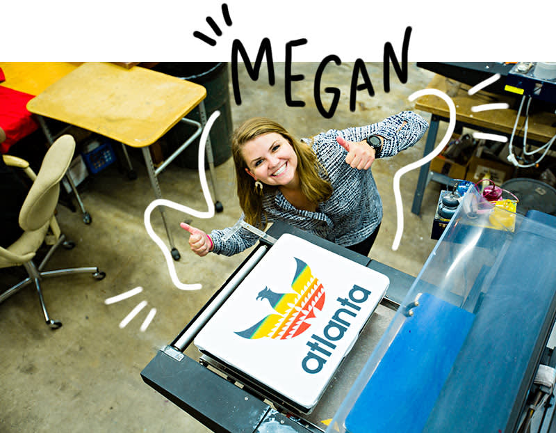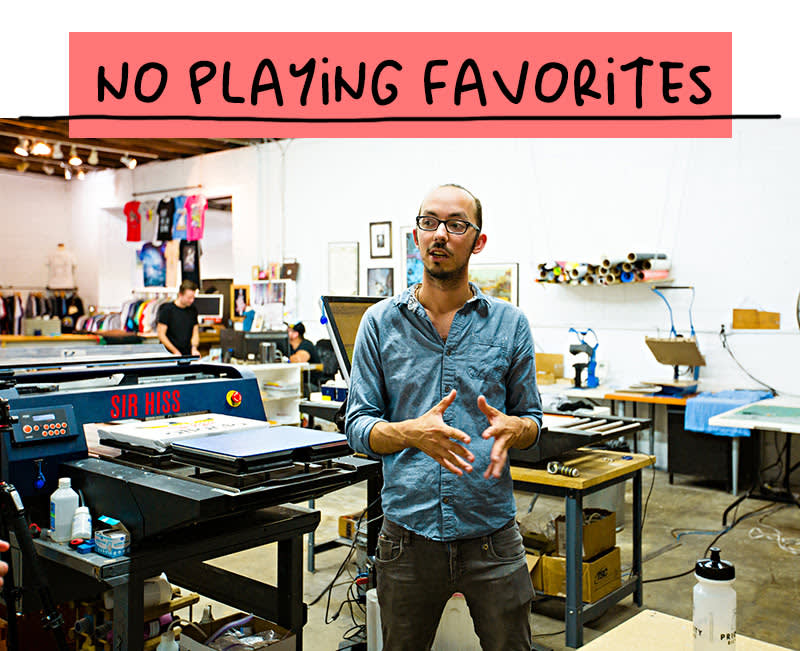 Not too long ago, I tagged along with Melissa on a very hot—and sweaty—Atlanta afternoon to see our pals over at Fallen Arrows. We were greeted by the company’s ever-cheerful co-founder Andrew Bellury and his equally friendly coworkers. After a bit of “oohing and ahhing” over custom t-shirt and embroidered patch designs, Andrew gave us a tour of the space—and a peek into how they run their business and keep their customers happy. He also gave me an ice pop that turned my mouth blue, so that won my heart over forever. Again: sweaty.