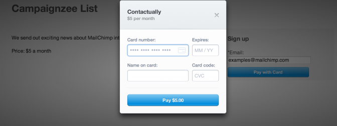 If you’re looking for a full-featured subscription management service that doesn’t require much hands-on work, Campaignzee is the way to go. Campaignzee uses Stripe‘s secure system to manage recurring payments to your Mailchimp list. Use a form hosted on Campaignzee’s site, or copy their code to embed into your own. You can also set up coupons and discount codes.