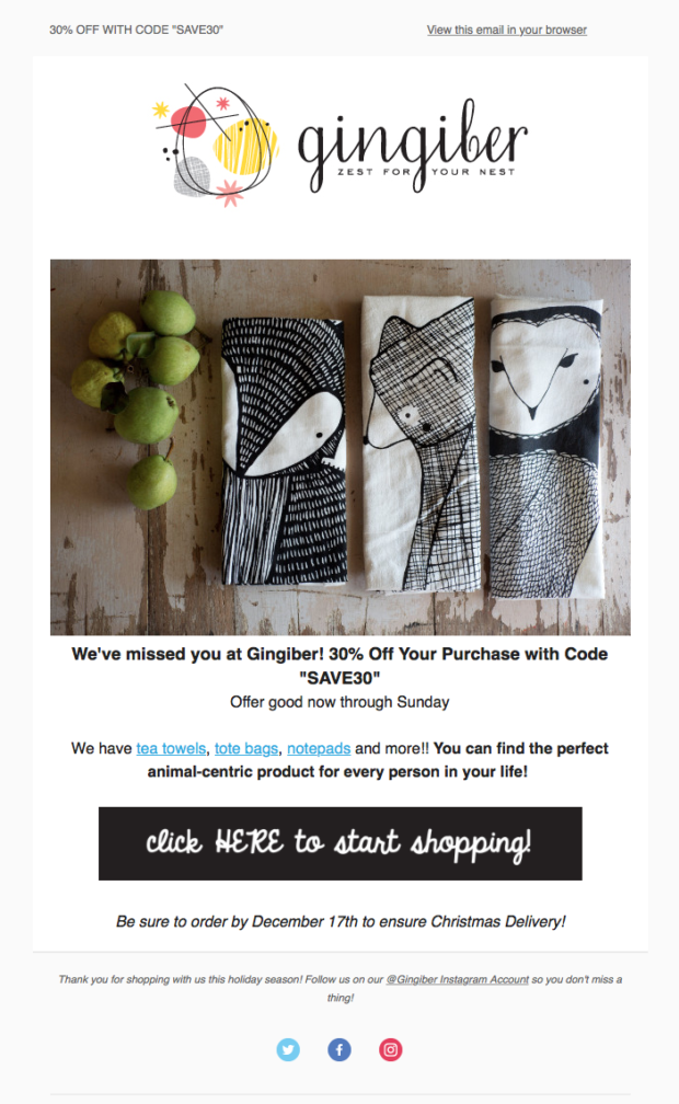 Gingiber first used this segmentation strategy leading up to the 2016 holiday season, and found that sending promotional emails to their most engaged customers a week before Black Friday led directly to increased sales over the holiday weekend. While they were impressed with how quickly customers started purchasing, Stacie says she used pre-built segments to guarantee their campaigns would get opened. Though, she does want to start targeting customers based on the products they purchase.
