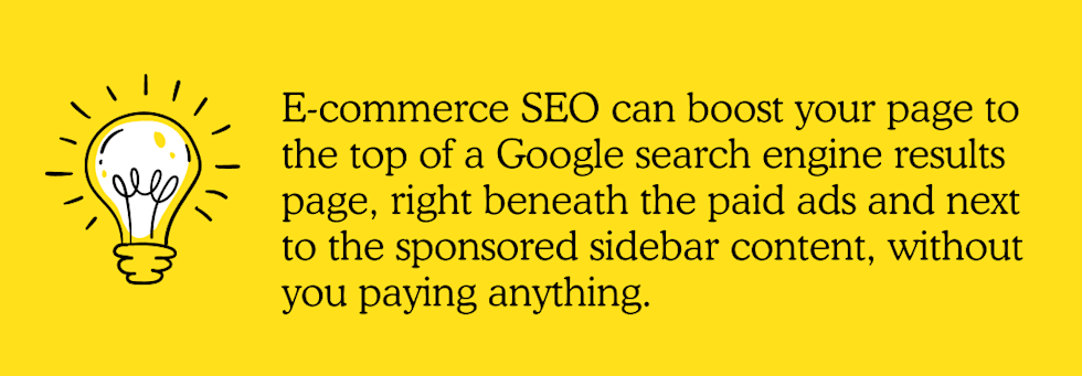Effective e-commerce SEO can boost your page to the top of a Google search engine results page (SERP), right beneath the paid ads and next to the sponsored sidebar content, without you paying anything—it merely requires an investment of time and effort.