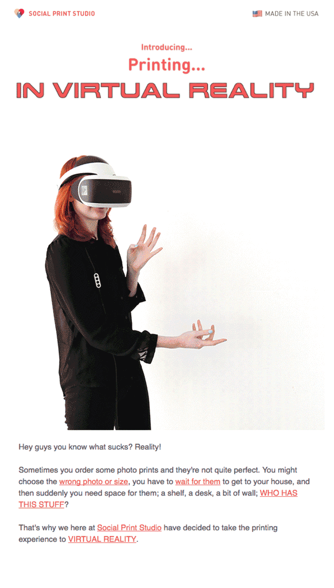Cat finds holiday campaigns particularly challenging, because she wants to avoid doing something stale or overdone. “We try to be a little zanier,” she says. Like the prank campaign they sent on April Fools’ Day to introduce Social Print 2.0, a virtual reality visor that lets you “virtually” print your photos. Or the campaign for last Valentine’s Day, which invited customers to submit their ideal romantic dinner menus for a chance to have it prepared by the Social Print Studio team.