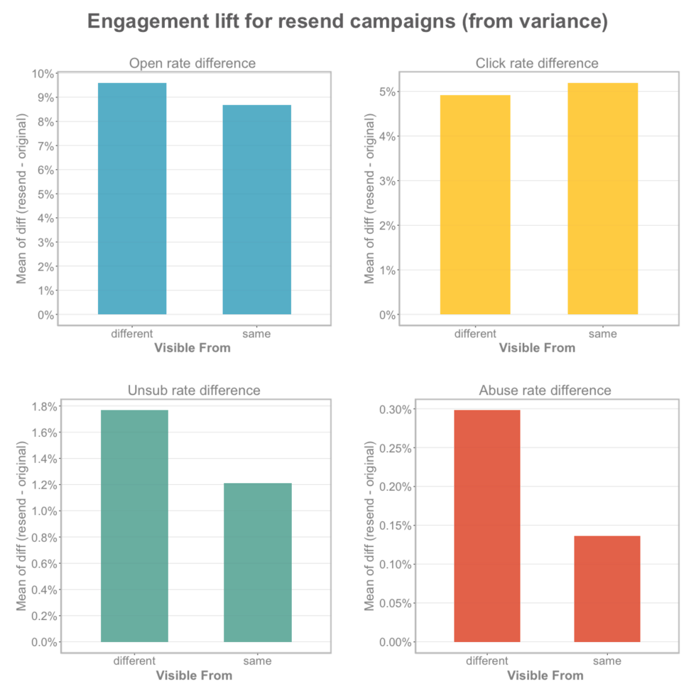 Open rates on resend campaigns don’t perform as well as they do on the first send, but they’re not terrible, either. We looked at 1,300 instances where the user sent a campaign and then re-sent it shortly after. The average open rate on the original campaign was 26.7%. That’s not bad, but these users knew they could do better, so they re-sent the campaign and got enough new opens to increase the original open rate by 8.7 points. That’s a significant-enough chunk of your list seeing a promotion that could make or break your quarter.