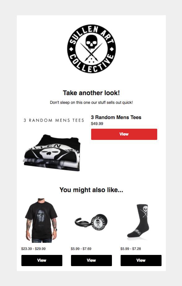 In addition to the content block that pulls in information about the last new or best-selling item a subscriber was viewing on your site, you’ll have the option to include a product recommendations block, too. The item they’ve been looking at might not be something they ultimately want to buy, but our highly personalized product recommendations will give them more options and may help them discover a different thing that they’ve gotta have.
